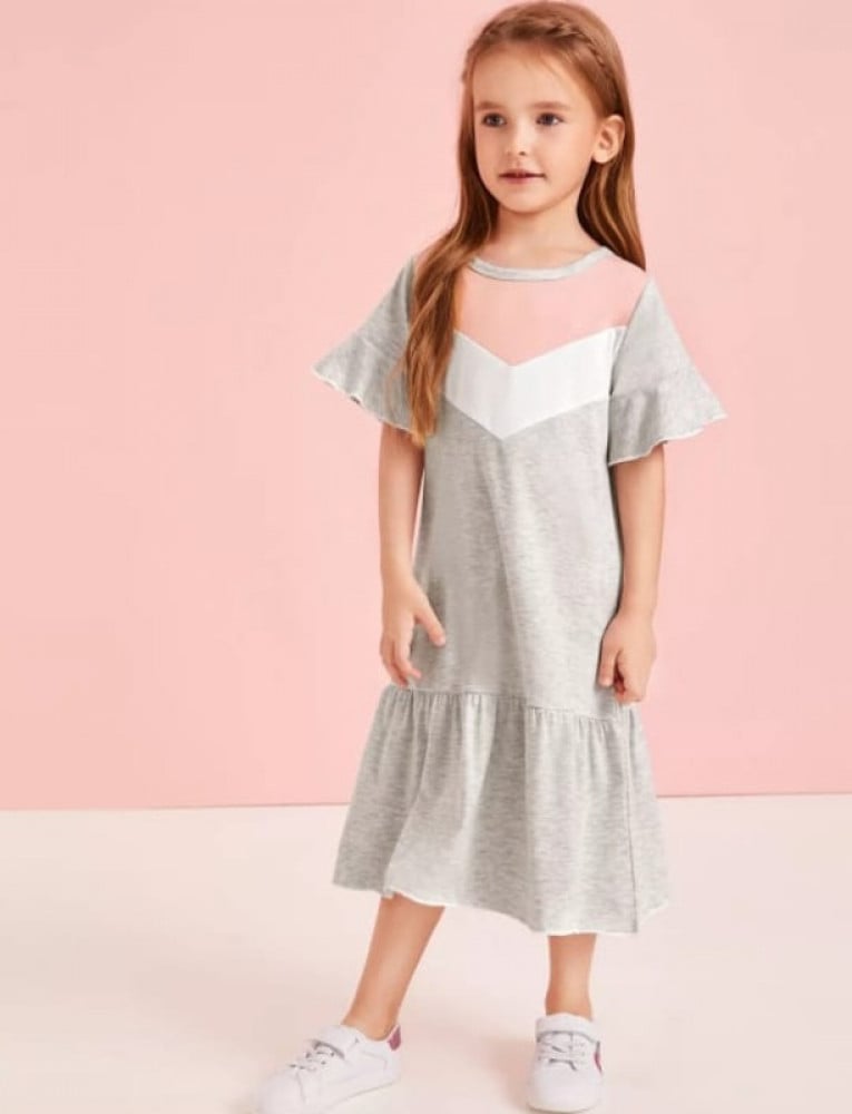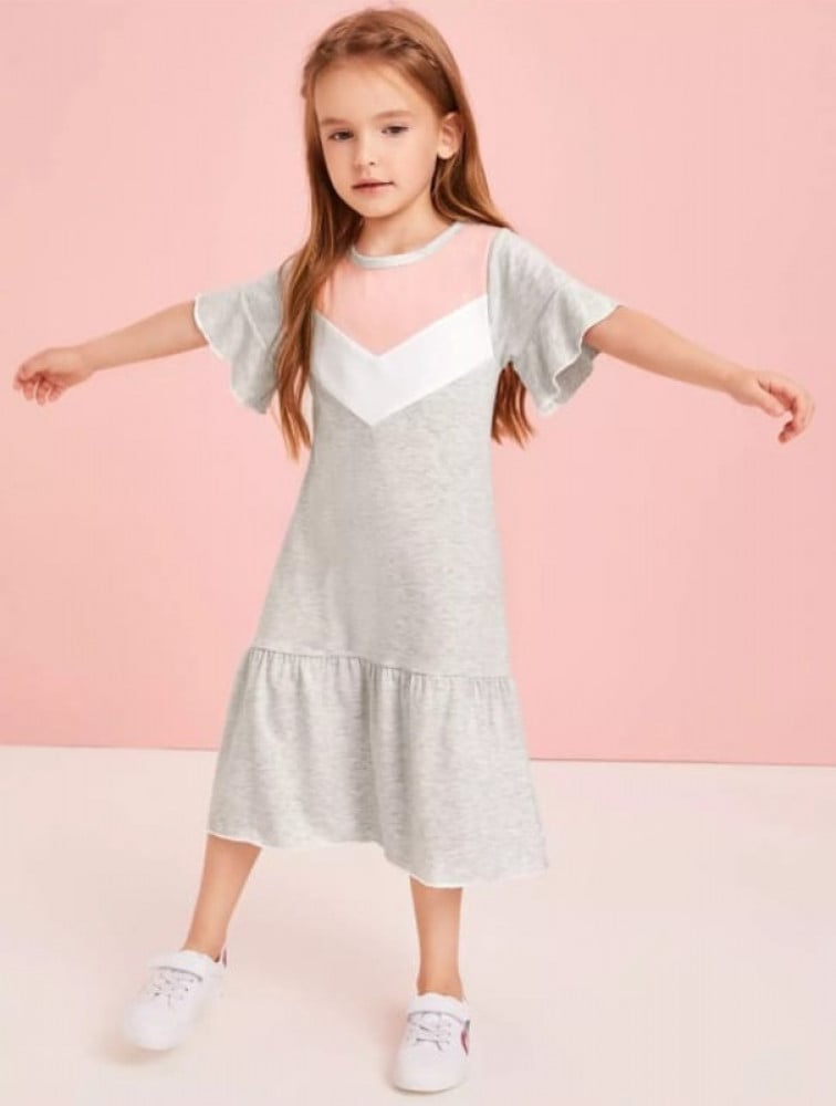 فستان بناتي بيدول بحافة مكشكش وبتصميم شارة الرتبة ، لون رمادي