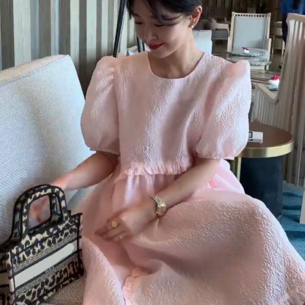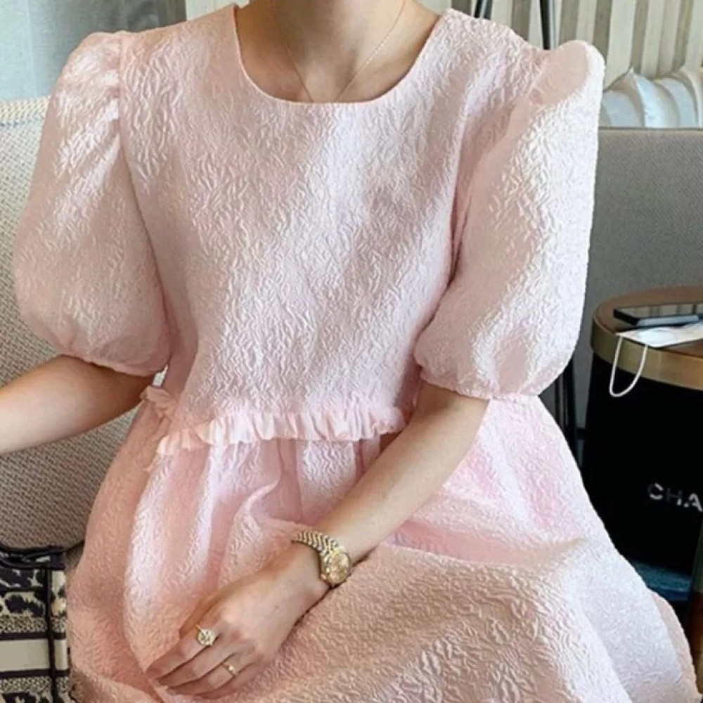 فستان كوري أنيق بناتي بطول الركبة مع أكمام بتصميم الفانوس ، لون وردي