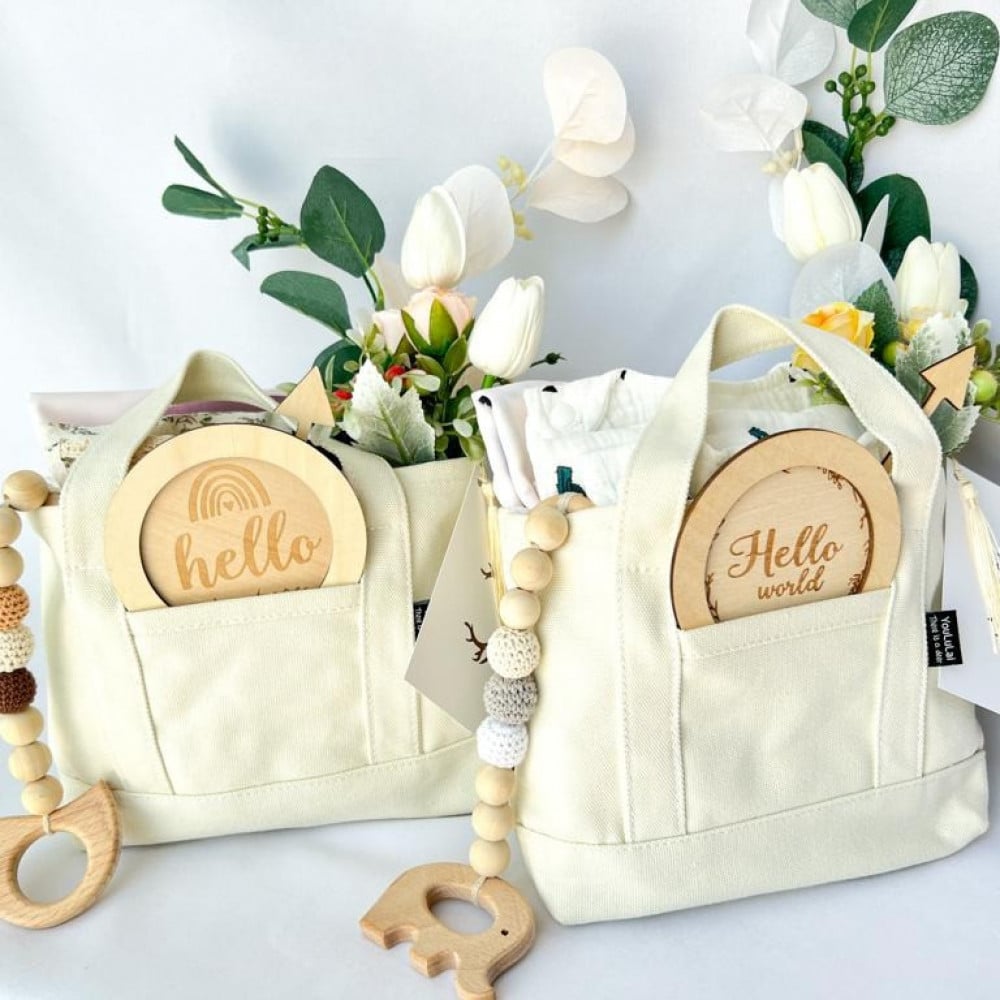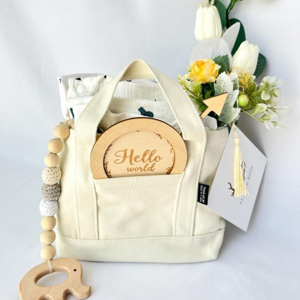 حقيبة قماشية بلون بيج مع طباعه اسم المولود على الحقيبة