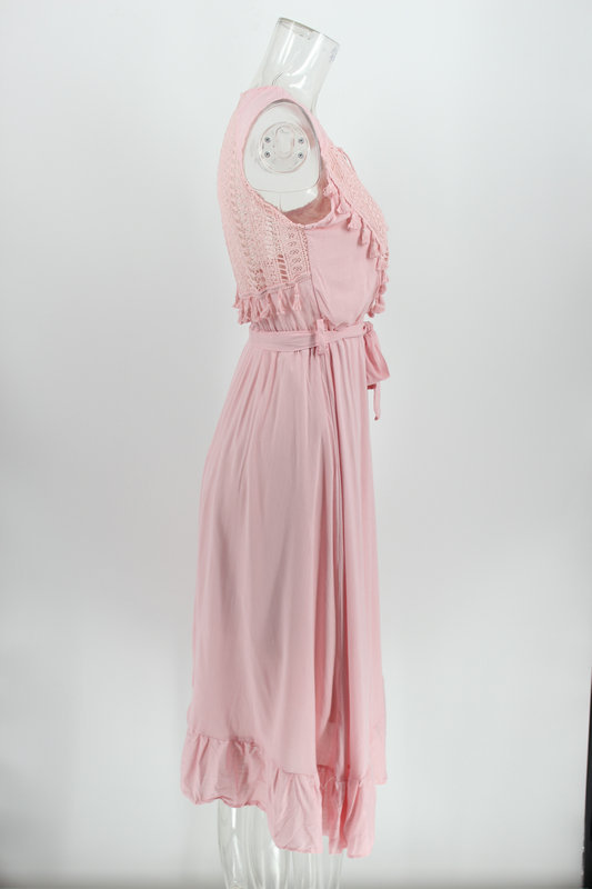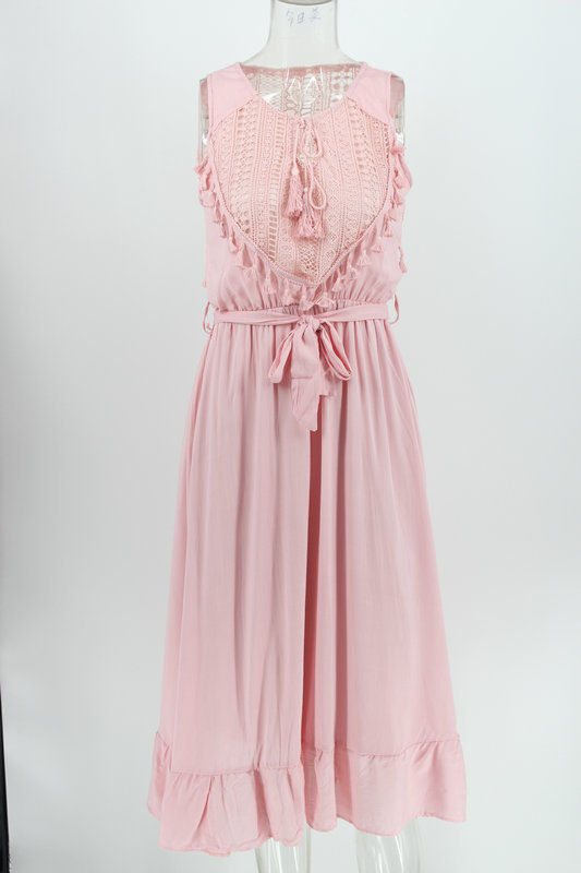 فستان نسائي بوهيمي بتصميمات الدانتيل ، ميدي الطول ، بلا اكمام ، متوفر بلونين