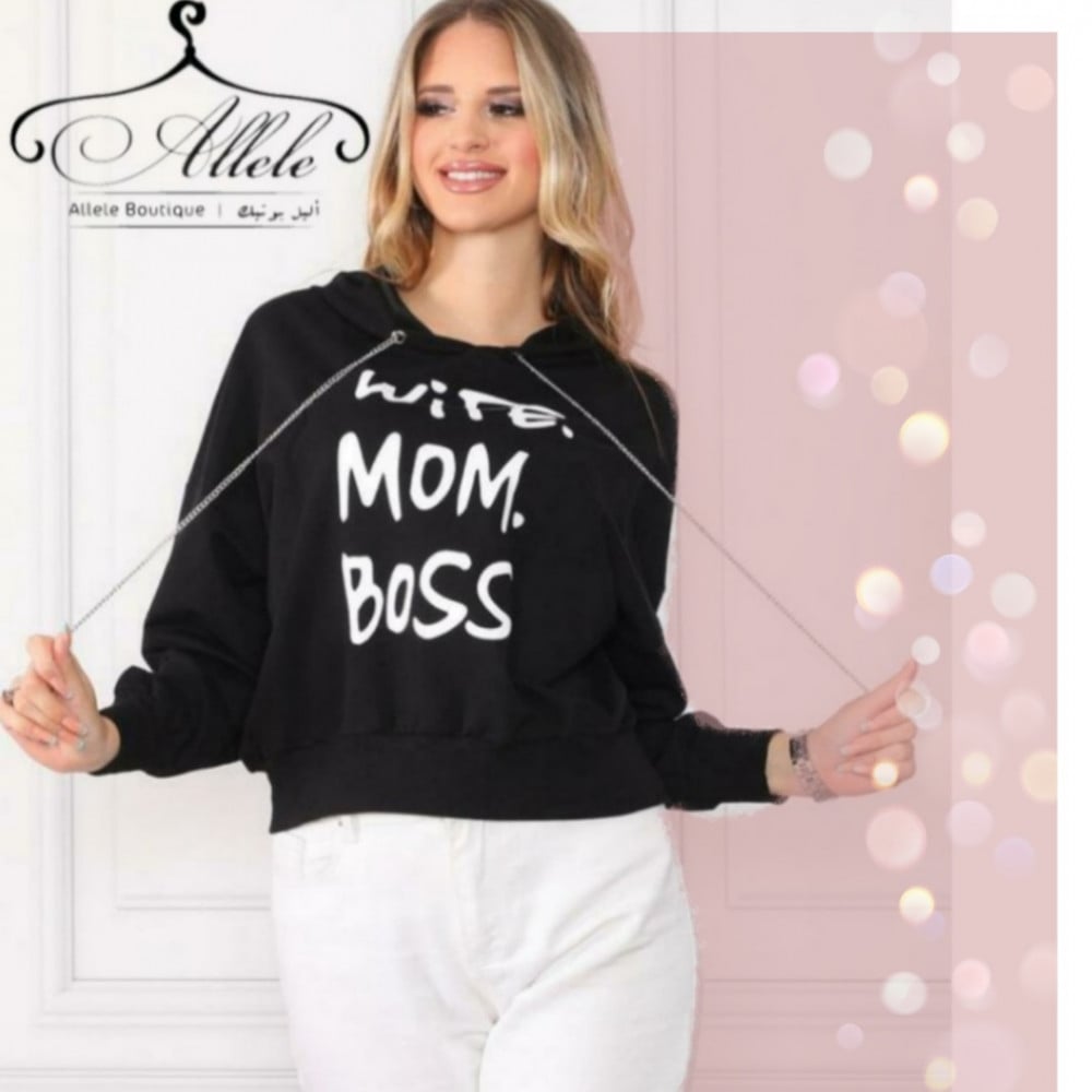 بلوفر نسائي عملي بغطاء الرأس ، تصميم عبارة ، لون أسود