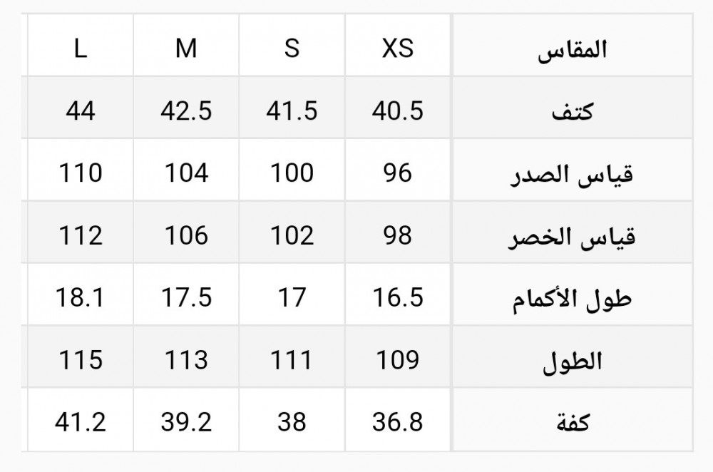 كتف (سم) : 42.5 cm ,قياس الصدر (سم) : 104 cm , قياس الخصر (سم) : 106 cm , طول الأكمام (سم) : 17.5 cm , الطول (سم) : 113 cm , كفة (سم) : 39.2 cm .