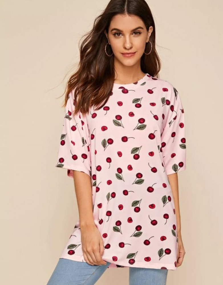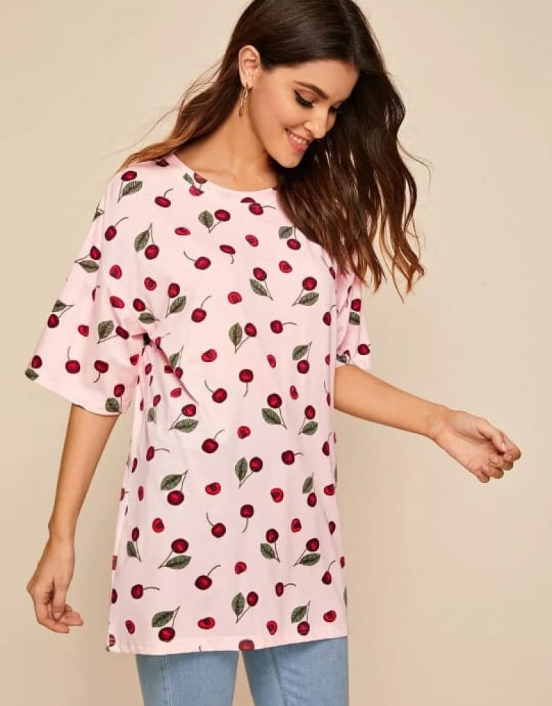 تيشيرت نسائي طويل بطباعة الكرز ، لون وردي