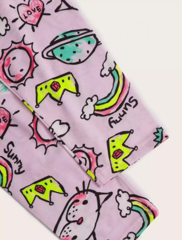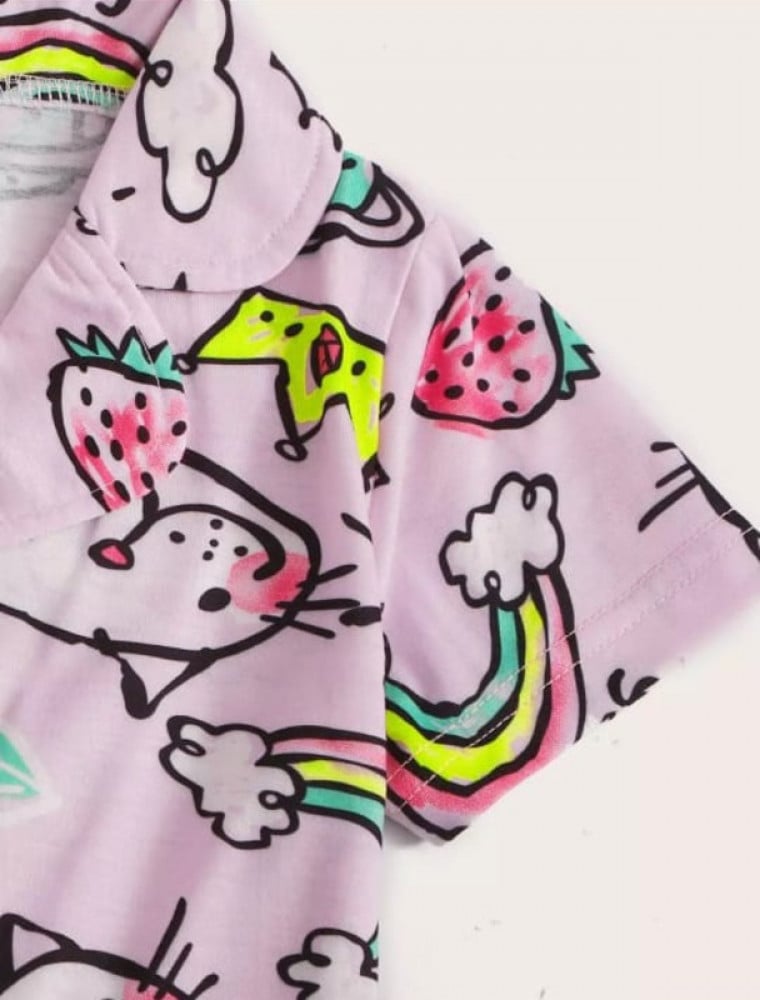 طقم بيجامة بناتي بياقة مسننة ، جرافيك كرتون ، لون وردي