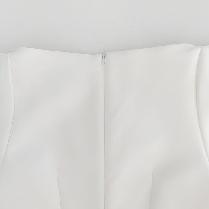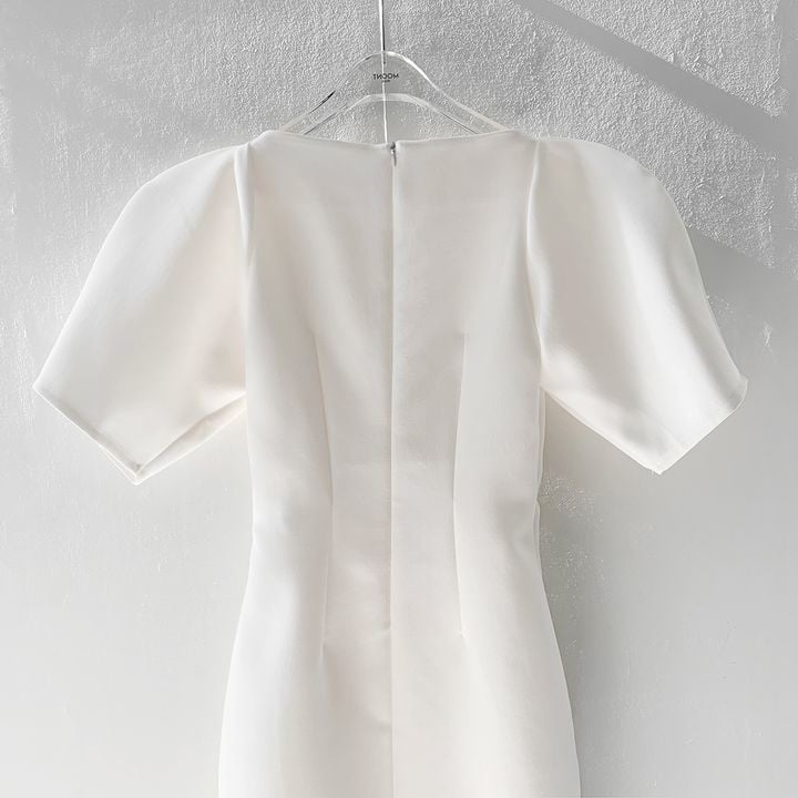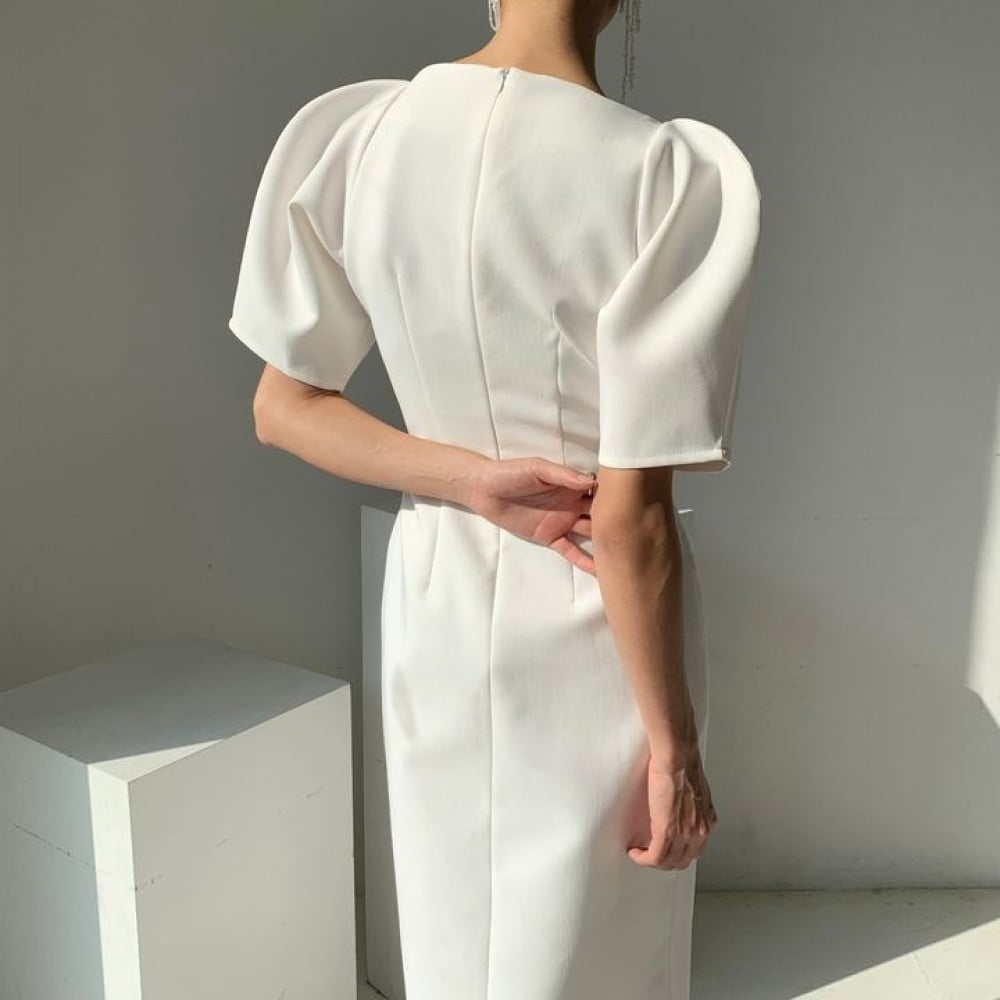 فستان نسائي أنيق ميدي بتصميم نفخة في الأكمام ، مزين بكسرات خصر ضيقة ، لون أبيض