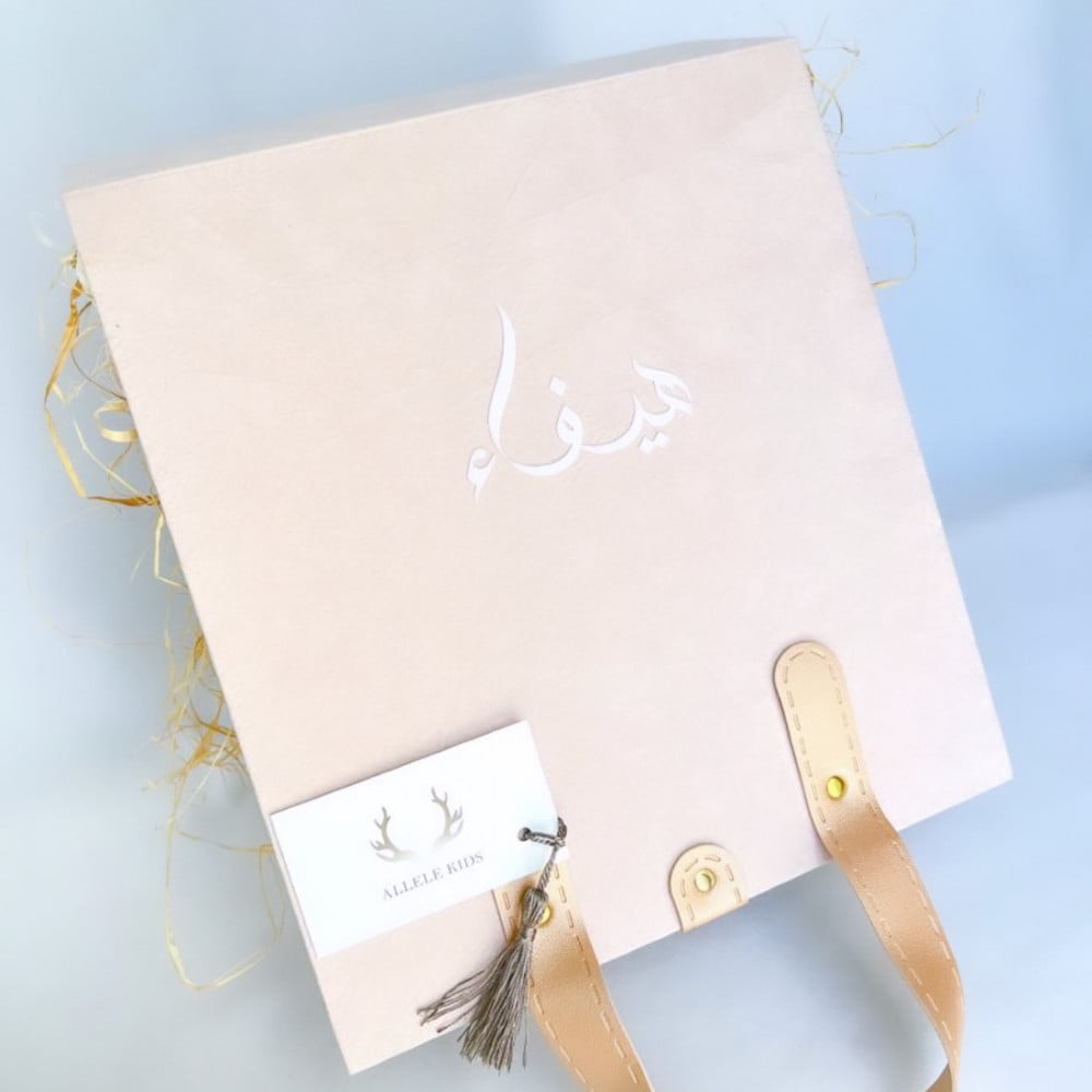▫️بوكس مخمل بلون بيبي بينك بحامل يد جلد مع طباعه اسم المولود بالجلد